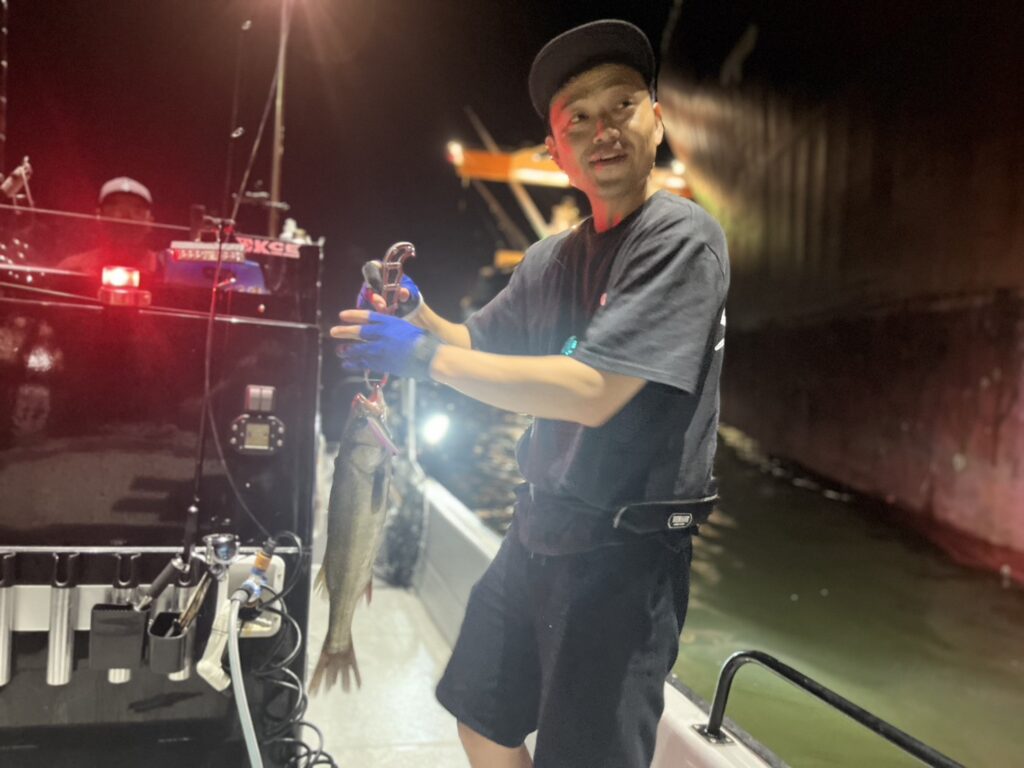 ボトムからゆっくりとバイブレーションで誘ってポツポツとセイゴをキャッチします😅なかなかハードですが、船長曰くまだこの日は良かったらしいですね😁